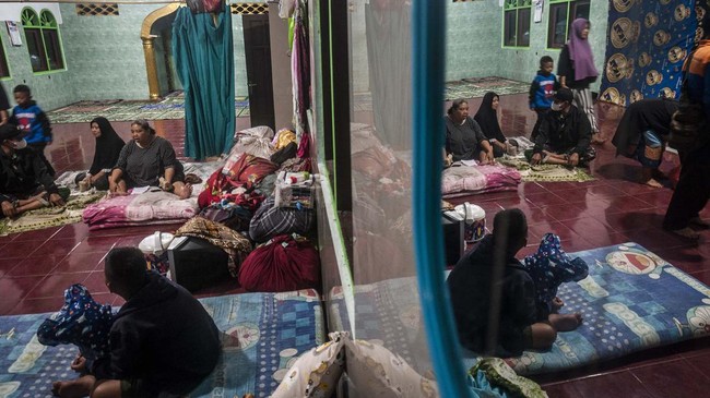 Warga terdampak banjir mengungsi di sebuah masjid di kawasan Rangkasbitung, Lebak, Banten, Selasa (3/1/2023) malam.