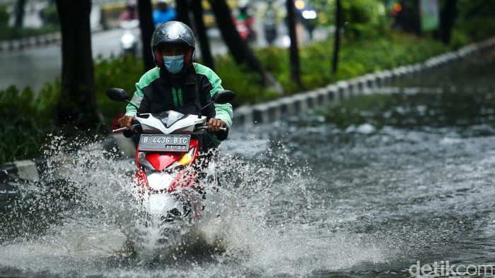 Para pengendara tetap nekat melintas meski jalanan tergenang air.