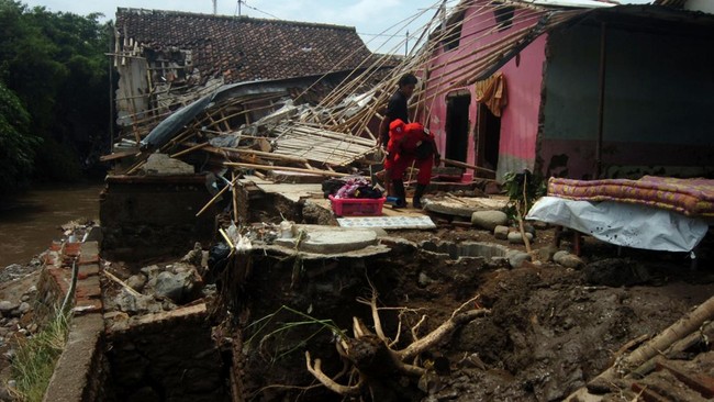 Brebes - Puluhan rumah mengalami kerusakan akibat diterjang banjir bandang. Petugas dan warga langsung membersihkan puing-puing rumah yang hancur.