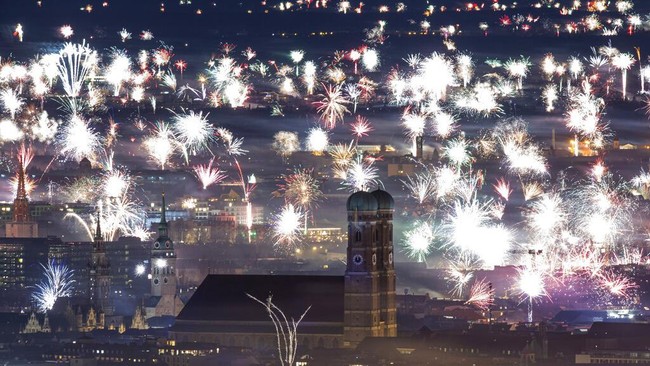 Tahun baru 2023 akhirnya tiba. Orang-orang menyambut Tahun Baru saat mereka menyaksikan kembang api meledak di atas Pantai Copacabana di Rio de Janeiro, Brasil, Minggu (1/1/2023). (AP Photo/Lennart Preiss)