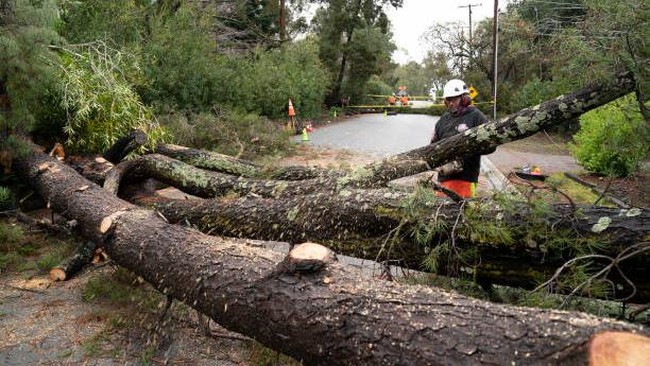 California - Badai musim dingin di california membuat sejumlah pohon tumbang. Pohon-pohon yang tumbang, langsung dievakuasi oleh petugas.