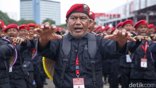 Jakarta - Ribuan kader PDIP yang tergabung dalam Satgas Cakra Buana dikerahkan dalam HUT PDIP ke-50. Mereka tampak semangat dan kompak membawa caping logo banteng.