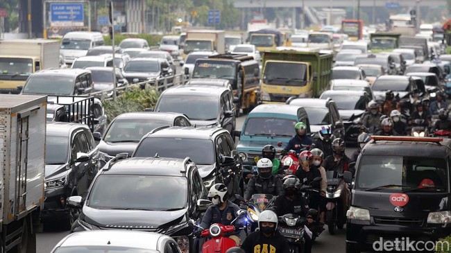 Jakarta - Kemacetan terlihat terjadi di Tol Dalam Kota dan Jalan MT Haryono, Jakarta, Kamis (12/1/2023). Begini potret kemacetan pada sekitar pukul 11.30 WIB.