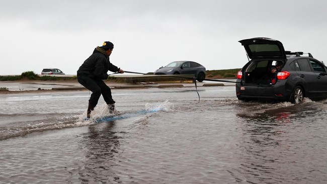 Amerika Serikat - Hujan badai yang melanda California meninggalkan banjir di sejumlah wilayah. Banjir yang belum menyusut dimanfaatkan warga untuk bermain selancar.