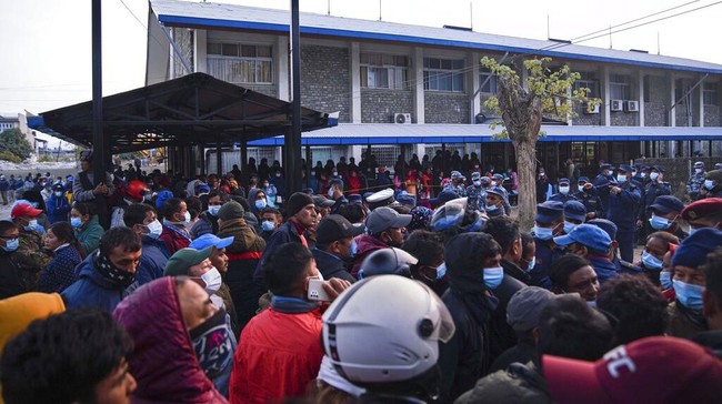 Kerumunan para keluarga dan kerabat korban pesawat jatuh terlihat di luar rumah sakit di Pokhara, Nepal,Minggu (15/1/2023).