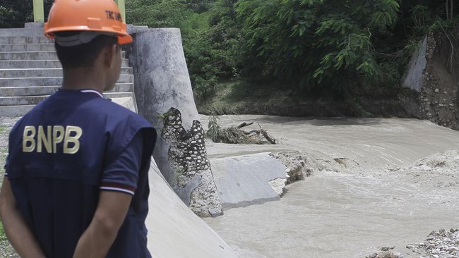 Seorang petugas Badan Penangulanggan Bencana (BNPB) memantau pintu air Bendungan Oesao yang jebol di Desa Pukdale, Kabupaten Kupang, NTT, Minggu (5/2/2023).