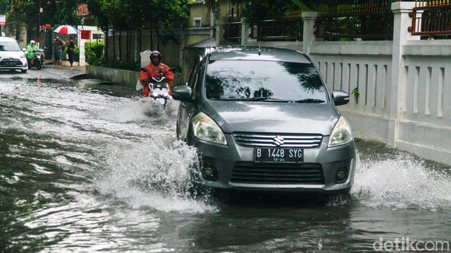 Jakarta - Jalan Cilandak 1, Jakarta Selatan, tergenang usai hujan deras, Selasa (7/2/2023). Kendaraan pun melambatkan lajunya saat melintas.