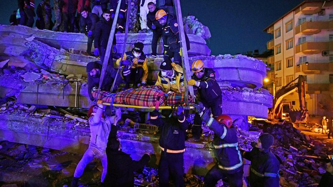 Turki - Sebuah keluarga diselamatkan dari puing-puing bangunan yang runtuh akibat gempa. Mereka diselamatkan usai terjebak di reruntuhan selama 40 jam.