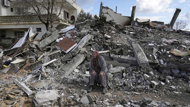 Seorang warga menangis sambil memandangi rumah-rumah yang rata dengan tanah akibat gempa M 7,8 di Osmaniye, Turki. AP Photo/Khalil Hamra.