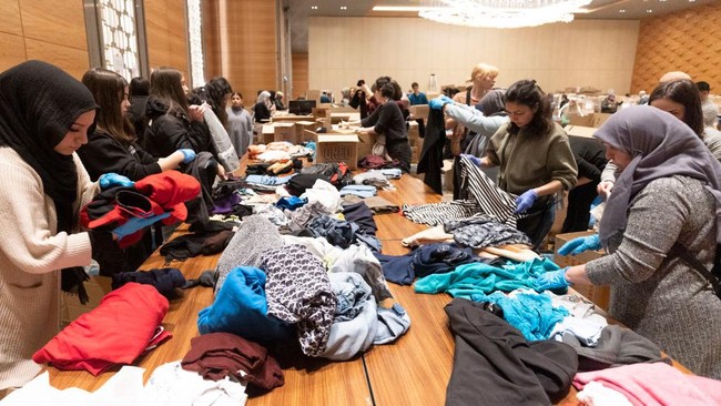Sejumlah anggota dari komunitas Turki mengemas pakaian ke dalam kotak di ballroom hotel Titanic Chaussee Berlin, Jerman, Rabu (8/2/2023).