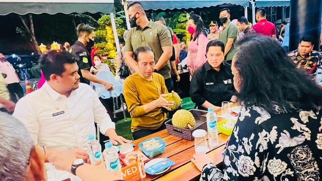Medan - Presiden Jokowi, Menteri BUMN Erick Thohir dan Walikota Medan Bobby Afif Nasution makan durian bareng. Momen itu terekam di sela-sela kunjungan Jokowi di Medan.