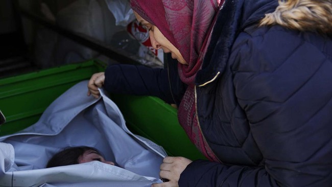 Seorang ibu tak kuasa menahan kesedihan di samping jenazah putrinya yang jadi korban gempa Turki, Kamis (9/2/2023). AP Photo/Hussein Malla.