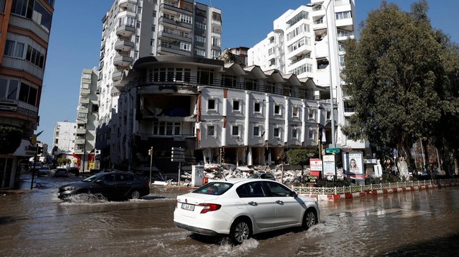 Turki - Permukaan laut naik di Iskenderun sekitar 200 meter setelah dua gempa dahsyat mengguncang Turki. Akibatnya jalan-jalan kota kebanjiran.