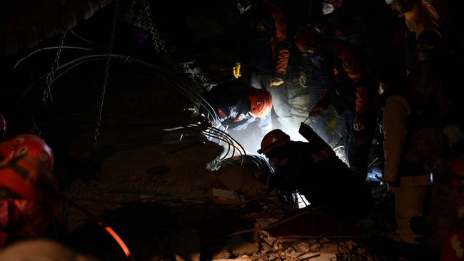 Turki - Pencarian korban gempa terus dilakukan di Turki. Bahkan, malam yang gelap pun tak menyurutkan semangat pencarian korban gempa.