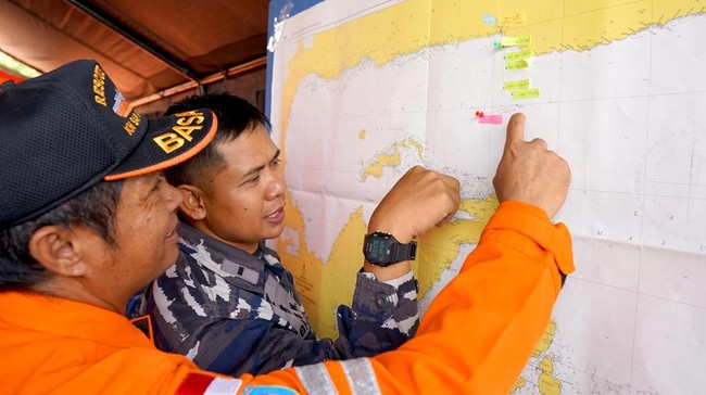 Personel TNI Angkatan Laut dan Basarnas memeriksa peta catatan lokasi terbaru dari kapal cepat Express Pricillia yang sedang dievakuasi di posko Basarnas di Pelabuhan di Kota Gorontalo, Selasa (14/02/2023).
