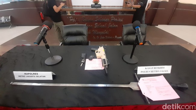 Jakarta - Giorgio Ramadhani (24), sopir mobil Fortuner, menggunakan pedang untuk merusak mobil Brio. Polisi menunjukkan pedang penghancur Brio kuning tersebut.