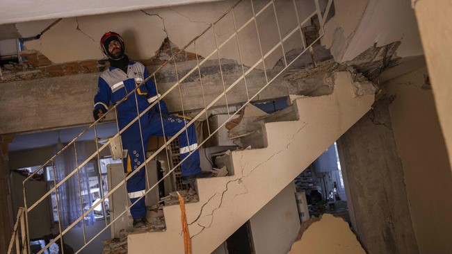 Anggota kelompok hak asasi hewan Turki HAYTAP, berjalan ke dalam bangunan retak untuk menyelamatkan seekor anjing di Antakya, tenggara Turki, pada Minggu(12/2/2023).