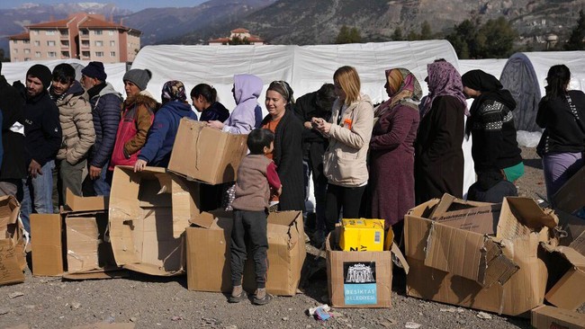 Orang-orang yang kehilangan rumah akibat gempa dahsyat, berbaris untuk menerima pasokan bantuan di kamp darurat, di kota Iskenderun, Turki selatan, Selasa(14/2/2023).