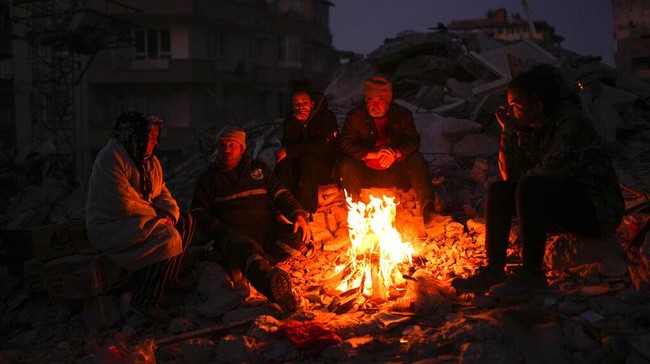 Antakya - Tim penyelamat masih terus mencari korban gempa Turki. Sebagian warga pun menunggu dengan menghangatkan diri pakai api unggun di tengah reruntuhan bangunan.