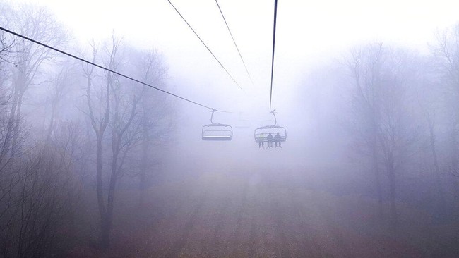 Pemain ski menaiki kursi gantung Gunnar melewati kabut tebal di Seven Springs Mountain Resort, Pennsylvania. (AP Photo/John Rucosky)