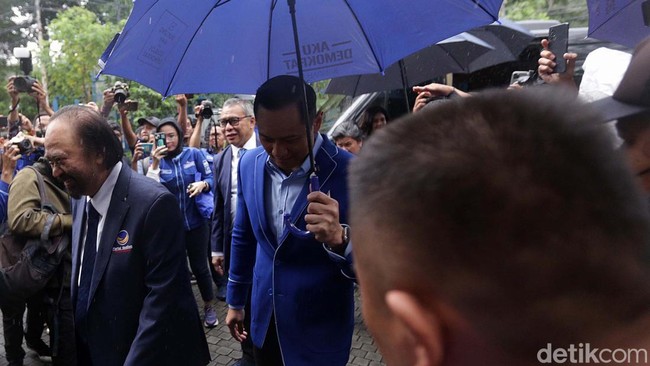 Jakarta - Ketum Partai NasDem Surya Paloh temui Ketum Partai Demokrat Agus Harimurti Yudhoyono (AHY). Surya Paloh sempat dipayungi SBY saat tiba di DPP PD.