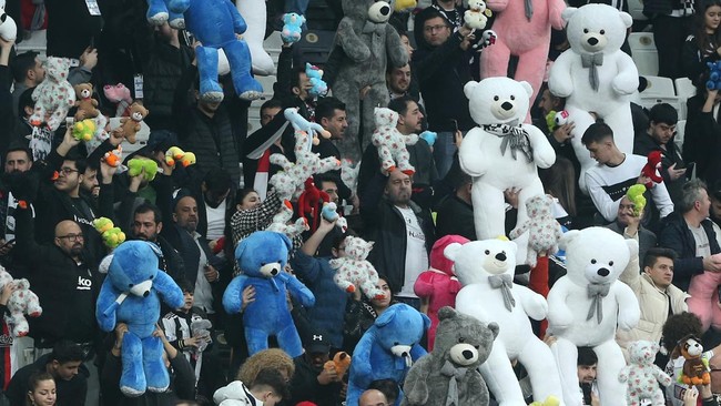 Penggemar Besiktas membawa boneka beruang di kursi penonton di Stadion Istanbul, Turki, Minggu (26/2/2023).