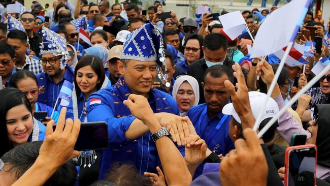 Palu - Ribuan masyarakat menyambut kedatangan Ketua Umum Partai Demokrat Agus Harimurti Yudhoyono (AHY) di Kota Palu Sulawesi Tengah dengan sambutan meriah.