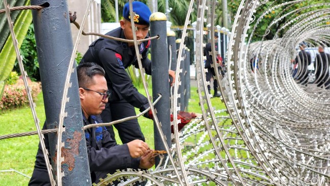 Jakarta - Petugas polisi memasang kawat berduri di depan gedung DPR, Jakarta. Hal itu dilakukan untuk mengantisipasi rencana aksi massa terkait Perppu Cipta Kerja.