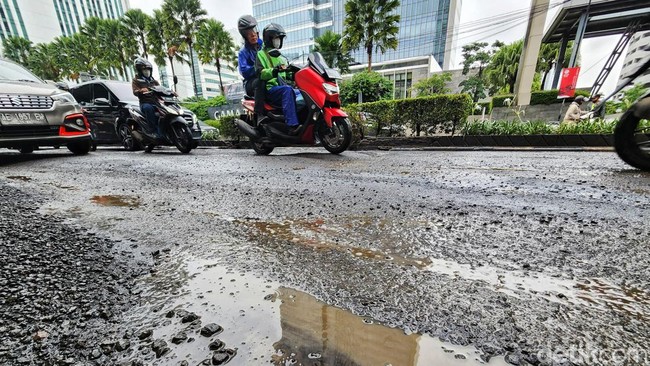 Jakarta - Pengendara yang melintas di Jalan Rasuna Said, Jaksel, harap berhati-hati, Kamis (2/3/2023). Jalan yang membentang di antara gedung pencakar langit itu rusak.