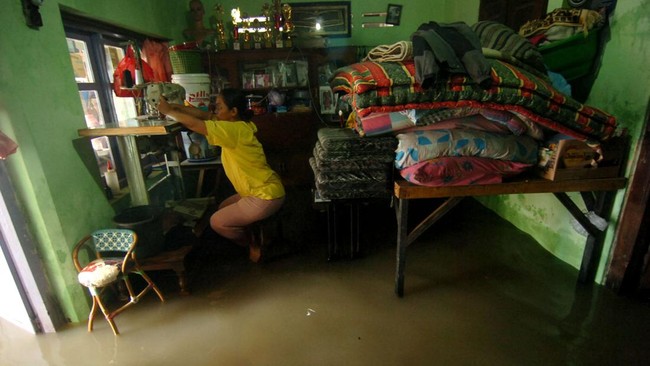 Seorang warga duduk di dalam ruangan rumahnya yang tergenang air di Kelurahan Sumurpanggang, Kecamatan Margadana, Tegal, Jawa Tengah, Kamis (02/03/2023).