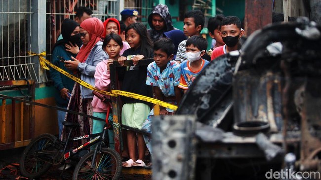 Jakarta - Lokasi kebakaran di sekitar Depo Pertamina Plumpang dipadati warga, Sabtu (4/3/2023). Mereka datang untuk melihat TKP kebakaran dari balik garis polisi.