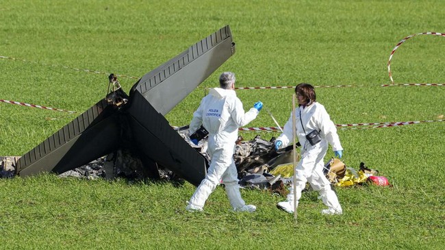 Salah satu pesawat jatuh di tanah lapang usai bertabrakan dengan pesawat lainnya di Guidonia, Roma, Italia.