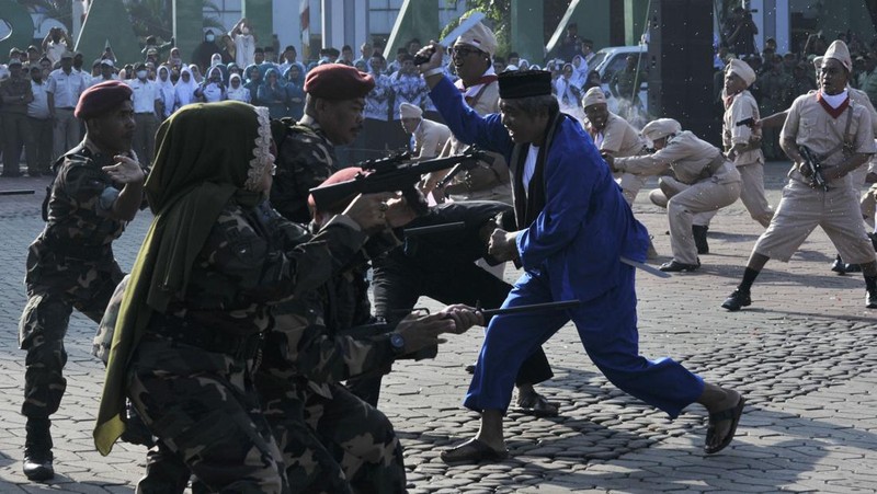 Sejumlah pegawai Organisasi Perangkat Daerah (OPD) mementaskan drama teatrikal Resolusi Rakyat Bekasi 1950 di Alun-alun M Hasibuan, Bekasi, Jawa Barat, Jumat (10/03/2023).
