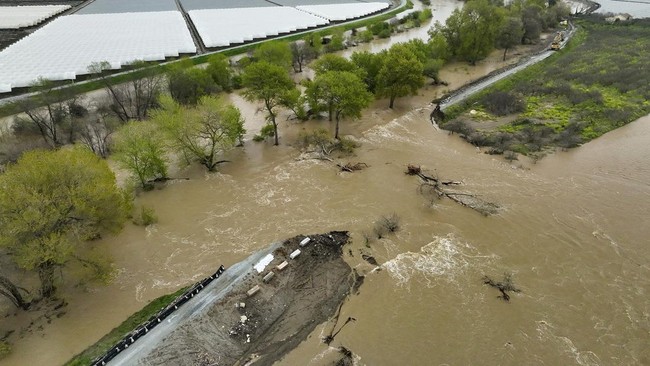 California - Hujan tidak hanya menyebabkan banjir di California. Tanggul Sungai Pajaro juga jebol akibat terjangan banjir. Ini penampakannya.