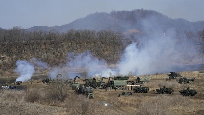 Amerika Serikat dan Korea Selatan menggelar latihan militer terbesar dalam lima tahun di Yeoncheon, Korea Selatan, Senin (13/3/2023).
