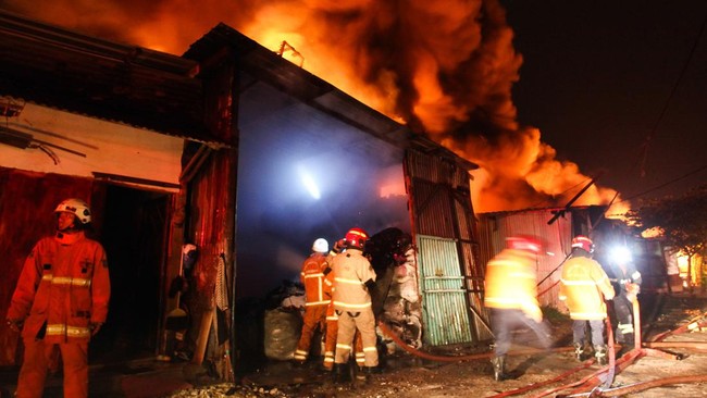 Jakarta - Kebakaran melanda lapak pengepul barang bekas dan mebel di kawasan Nambangan, Surabaya, Jawa Timur, Rabu (15/3). Belum diketahui penyebab kebakaran tersebut.