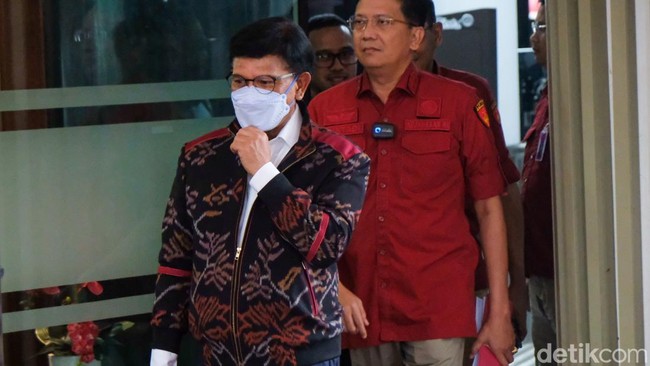 Jakarta - Menkominfo Johnny G Plate meninggalkan Kejagung usai diperiksa 6 jam sebagai saksi kasus dugaan korupsi proyek BTS. Plate enggan bicara soal materi pemeriksaan.
