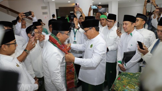 Ketum PPP Muhammad Mardiono menyambut kedatangan Ketum PBNU KH Yahya Cholil Staquf dengan mengalungkan serban saat baru datang di arena Ngaji Budaya yang digelar PPP di Teater Tanah Airku Taman Mini Indonesia Indah, Rabu (15/3) malam.