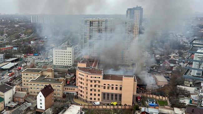 Asap akibat ledakan membubung di atas sebuah bangunan milik bagian patroli perbatasan dinas keamanan federal FSB Rusia di distrik kota selatan Rostov-on-Don, Rusia, Kamis (16/3/2023).