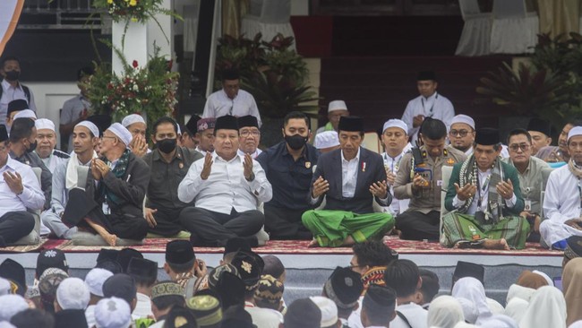 Presiden Joko Widodo (tengah) didampingi Menteri Pertahanan Prabowo Subianto (dua kiri) berdoa bersama saat Muktamar Rabithah Melayu-Banjar di Halaman Pendopo Bersinar, Kabupaten Tabalong, Kalimantan Selatan, Jumat (17/3/2023).