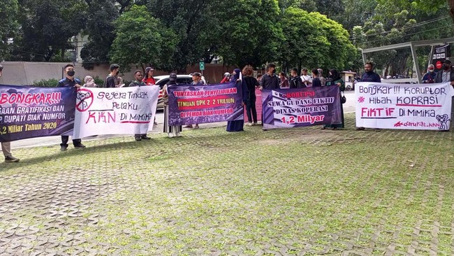 Jakarta - Massa Lembaga Monitoring Hukum dan Keuangan Negara (LMHKN) demo di gedung KPK. Mereka minta dugaan korupsi di Kabupaten Mimika dan Biak Numfor diusut.
