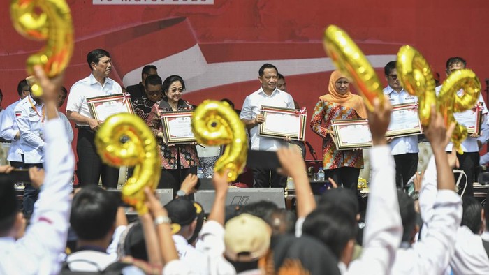 Jakarta - Megawati Soekarnoputri hingga Menko Marvest Luhut Binsar Pandjaitan dan para kades dari berbagai asosiasi berkumpul di GBK dalam rangka HUT ke-9 UU Desa.
