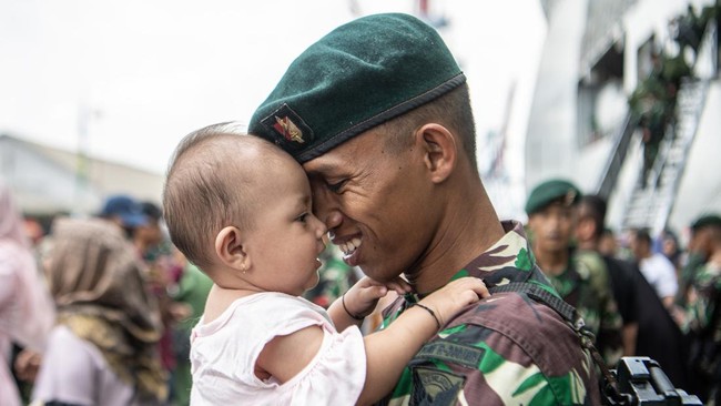 Prajurit Raider memeluk anaknya usai mengikuti upacara pemberangkatan satgas Pamtas RI-Papua Nugini ke wilayah Provinsi Papua dan Papua Barat. Sebanyak 450 prajurit Raider Yonif 200/Bhakti Negara Kodam II/Sriwijaya dan 400 prajurit Yonif 133/Yudha Sakti Kodam I/Bukit Barisan diberangkatkan menuju Provinsi Papua dan Papua Barat dengan menggunakan KRI Banda Aceh-593 untuk menjalankan tugas menjaga keamanan bersama dengan satuan-satuan lainnya selama 12 bulan.