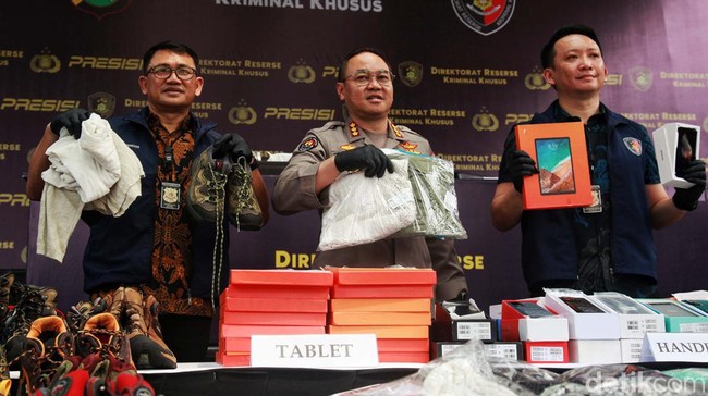 Direktur Reserse Kriminal Khusus Polda Metro Jaya Kombes Auliansyah Lubis, Kabid Humas Polda Metro Jaya Kombes Trunoyudo Wisnu, dan Kasubdit Indag Direskrimsus Polda Metro Jaya AKBP Victor Inkiriwang menunjukkan barang bukti baju bekas di Polda Metro Jaya, Jumat (24/3/2023).
