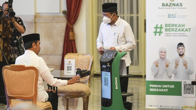 Jakarta - Presiden Joko Widodo dan Wakil Presiden Ma'ruf Amin membayar zakat melalui Baznas, di Istana Kepresidenan Jakarta. Pembayaran dilakukan dengan pindai kode QR.