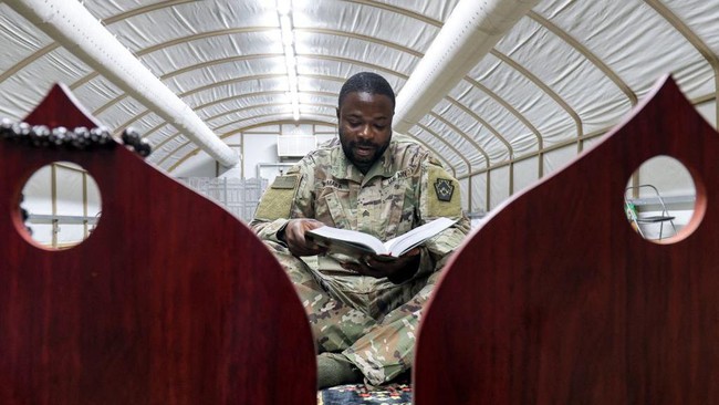 Seorang tentara Muslim AS membaca Al-Qur'an di sebuah tenda kapel selama bulan suci Ramadan di Kamp AS Arifjan, Kota Kuwait, Selasa (28/3/2023). Kamp Arifjan AS, terletak sekitar 60 kilometer selatan dari Kota Kuwait. Mereka menjalankan ibadah puasa di bawah suhu yang terik mencapai 50 derajat Celcius.