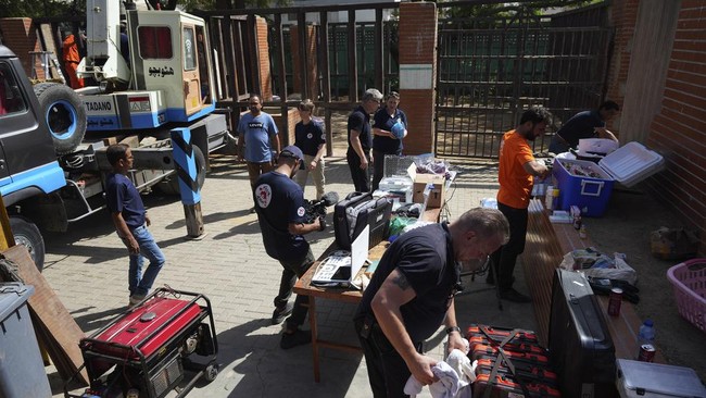 Dokter hewan dari kelompok kesejahteraan hewan global, Four Paws, bersiap untuk melakukan pemeriksaan kesehatan gajah bernama "Noor Jehan" di Kebun Binatang Karachi, di Karachi, Pakistan, Rabu (5/4/2023). Dokter hewan asing mengunjungi gajah yang sakit di kebun binatang Pakistan selatan di tengah kekhawatiran yang meluas atas kesejahteraan dan kondisi kehidupannya.