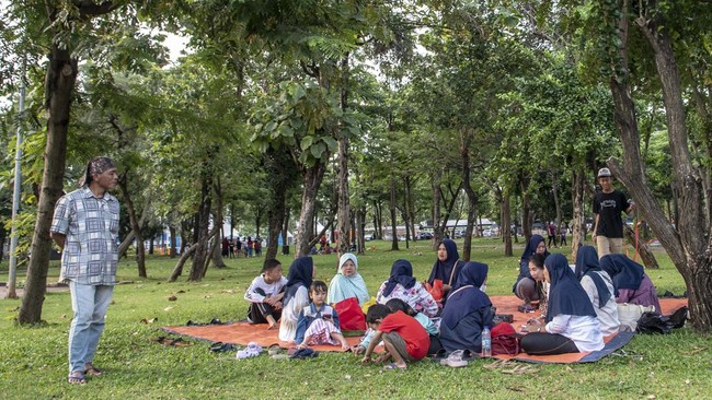 Warga beraktivitas sambil menunggu berbuka puasa di Taman Kota Waduk Pluit, Jakarta Utara, Minggu (9/4/2023).