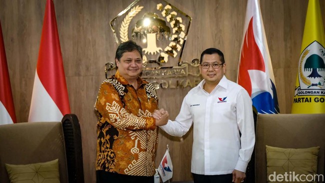 Airlangga Hartarto menyambut Hary Tanoe di DPP Golkar, Jalan Anggrek Nelly Murni, Jakarta, Senin (10/4/2023).
