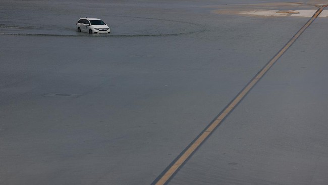 Sebuah kendaraan melaju melintasi air di landasan pacu Bandara Internasional Fort Lauderdale-Hollywood, Fort Lauderdale, Florida, Kamis (13/4/2023).